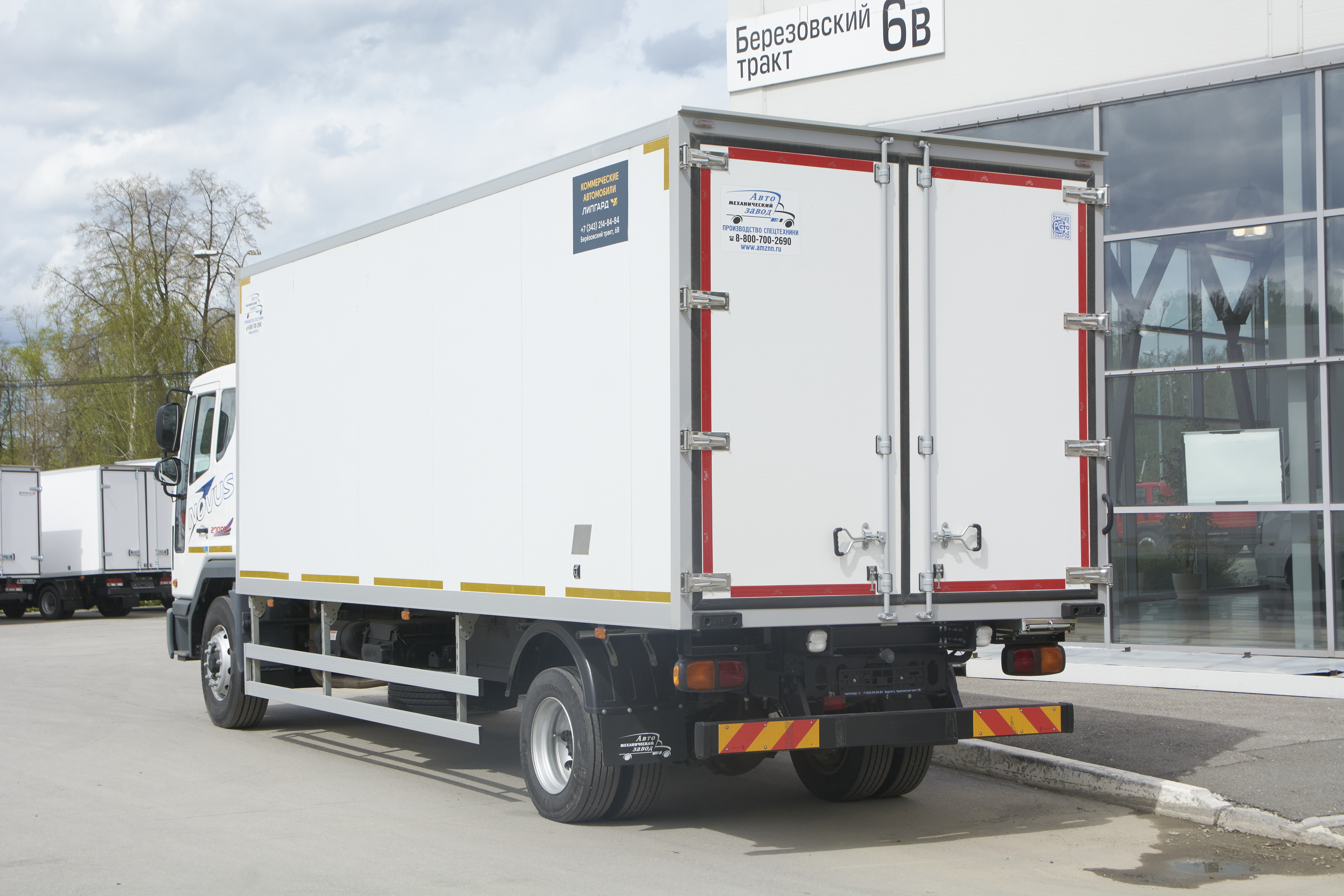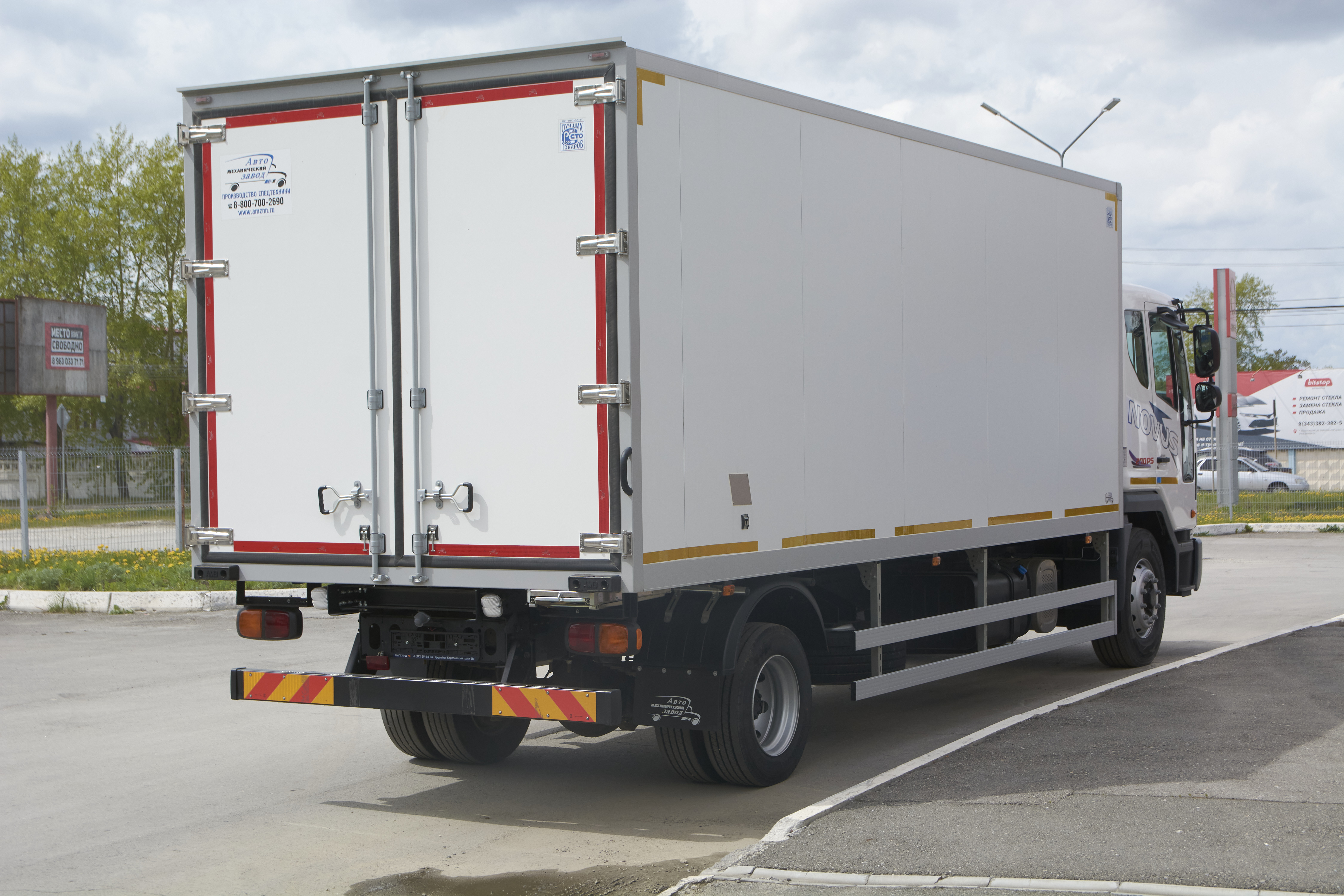Автофургон собран из сэндвич-панелей, изготовленных по бескаркасной технологии методом вакуумной склейки. В качестве облицовки сэндвич-панелей используется оцинкованный металл белого цвета. Внутренняя обшивка выполнена из оцинкованного металла белого цвета. В качестве теплоизолирующего материала применен высококачественный экструдированный пенополистирол. Фургон имеет расположенные сзади двухстворчатые двери с 3-х лепестковыми резиновыми уплотнителями, обеспечивающими герметичность. Габаритное (4 фонаря), контурное освещение (4 фонаря на металлических площадках) с диодными лампами. Перед окраской все детали проходят абразивоструйную обработку (установка абразивоструйная DSMG”). Окраска подрамников — 2-слойное покрытие 2-компонентной полиуретановой эмалью. Окраска и сушка производится в окрасочно-сушильной камере.